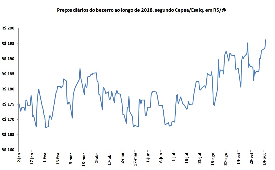 O preço do bezerro iniciou o ano de 2018 cotado a R$175,20 por arroba e no dia 16 de outubro o valor era de R$196,30 por arroba, uma alta acumulada no ano de 12,0%.