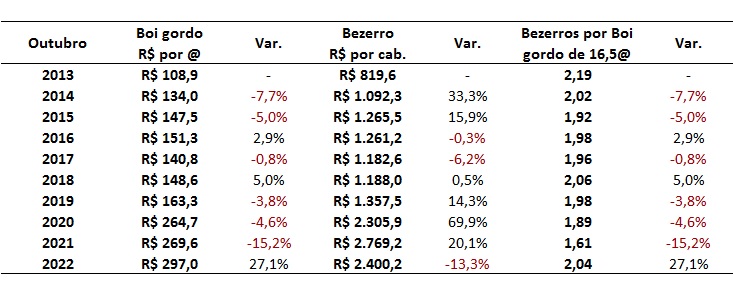 Na parcial de 2022, até outubro, dia 7, o preço do boi gordo (Cepea), acumulou queda de 9,3%, enquanto o bezerro (Cepea, Mato Grosso do Sul) a perda foi maior no período, de 18,6%. As médias mensais parciais de outubro seguem apresentadas abaixo.