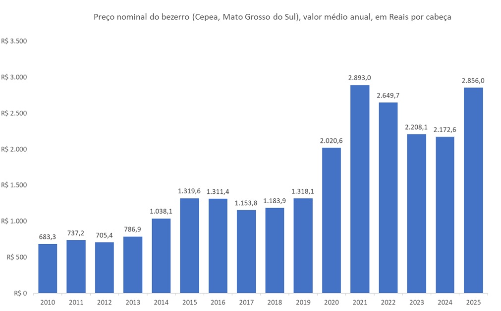 A Figura apresenta os dados médios anuais do preço nominal do bezerro (Cepea, Mato Grosso do Sul), entre 2010 e 2025 (até o dia 23 de dezembro), em Reais por cabeça.