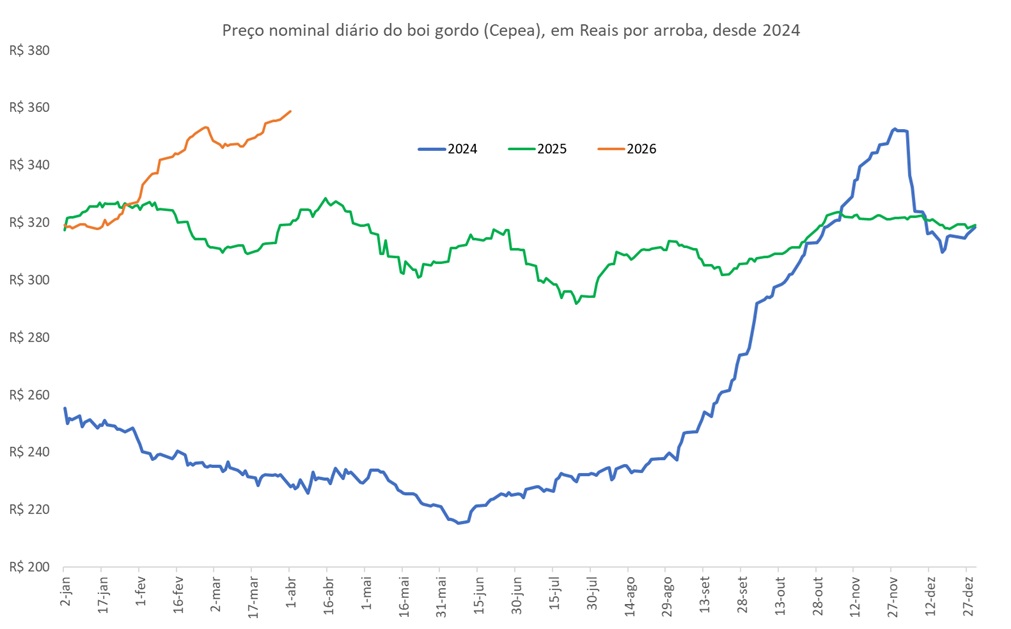 O preço médio nominal do boi gordo em março de 2026 de R$350,2 por arroba foi o maior da série do Cepea, superando a máxima anterior de março de 2022, quando foi cotado a R$344,7 por arroba (quarta Figura).