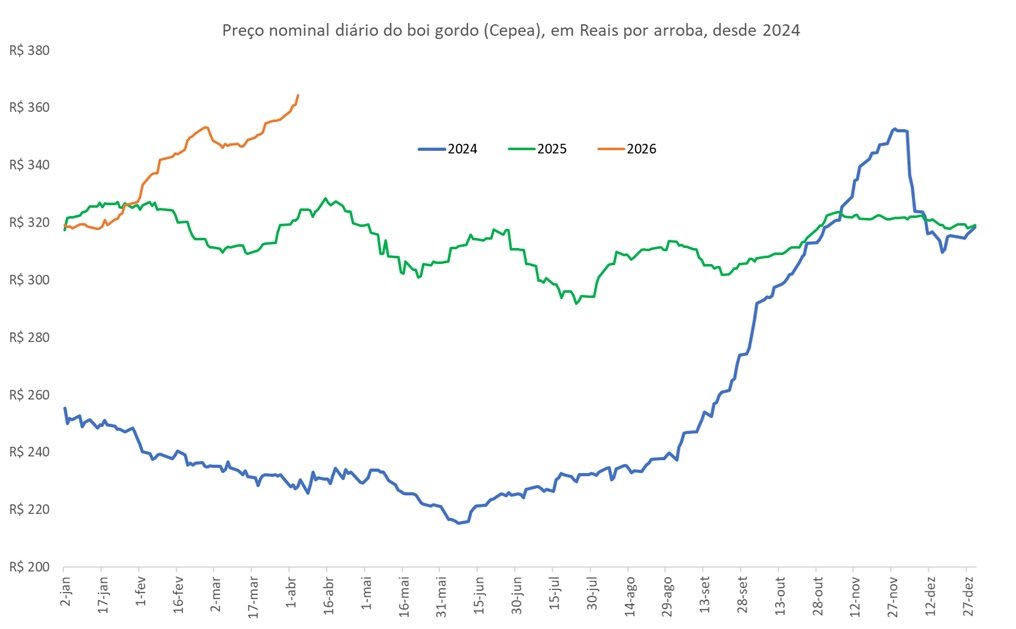 E assim como a categoria de reposição, o preço do animal pronto para o abate também foi recorde, cotado a R$364,3 por arroba (Cepea), alta de 14,1% frente ao último valor de 2025 e descolado do valor praticado no mesmo período dos anos anteriores (segunda Figura).