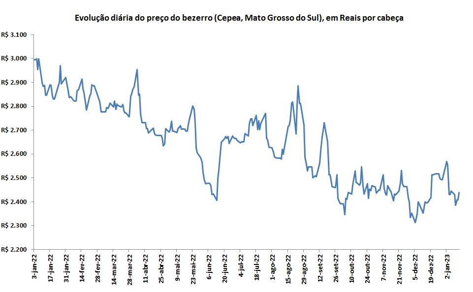 Apesar de poucos dados em 2023, considerando o valor diário, desde o início do ano o preço do bezerro acumulou queda, como mostram os dados da segunda Figura abaixo. O bezerro (Cepea, Mato Grosso do Sul) iniciou o ano de 2023 cotado a R$2.568,7 por cabeça e no dia 13 de janeiro o valor ficou em R$2.439,2 por cabeça.