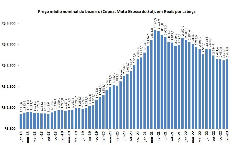 A Figura a seguir ilustra a evolução mensal do preço médio nominal do bezerro (Cepea, Mato Grosso do Sul), avaliado em Reais por cabeça, entre janeiro de 2018 e a parcial de janeiro de 2023 (até o dia 13).