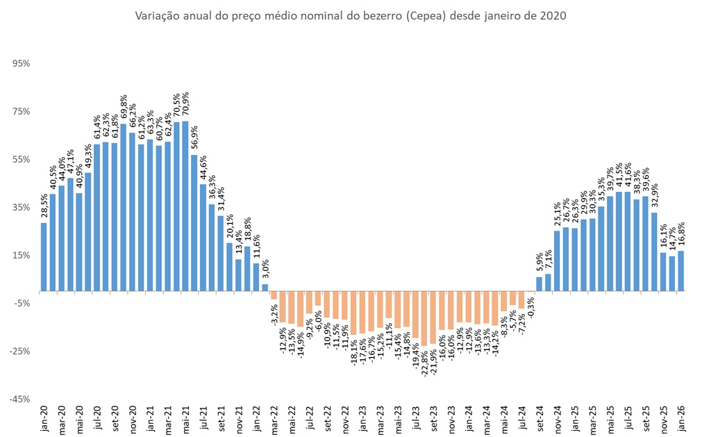 A alta no preço do bezerro na parcial de janeiro de 2026 (até o dia 28) em relação a janeiro de 2025 foi de 16,8%. No caso do boi gordo, o preço Cepea, na mesma base de comparação, apresentou queda de 1,4%.