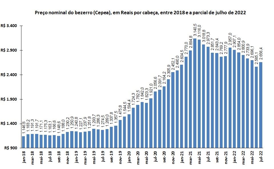 O fato é que apesar da recuperação na parcial do mês de julho de 2022, o valor do bezerro segue abaixo do preço nominal observado em julho de 2021, quando a média mensal ficou em R$2.973,3 por cabeça.