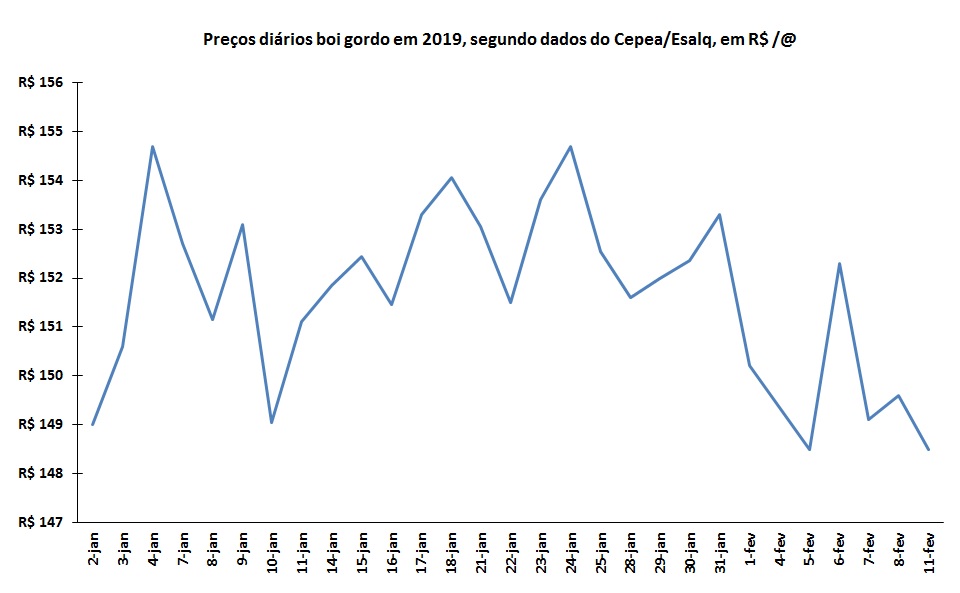 Isso porque o preço do boi gordo iniciou o ano cotado a R$149,0 por arroba e no dia 11 de fevereiro o valor foi de R$148,50, menor valor desses cerca de 40 dias de 2019.