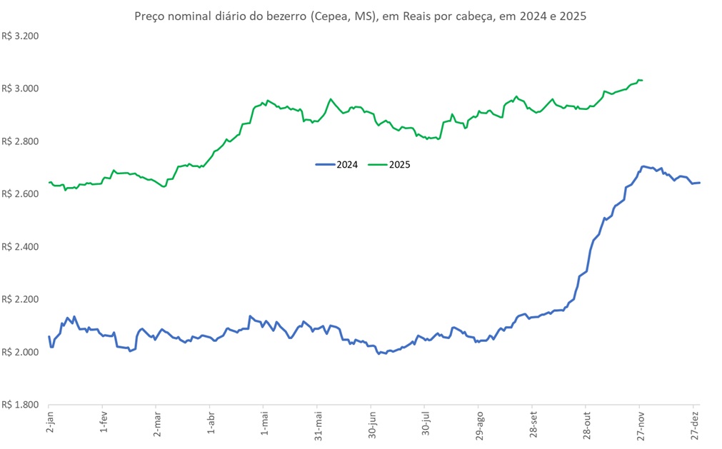 A Figura ilustra a evolução diária do preço nominal do bezerro (Cepea, Mato Grosso do Sul), avaliado em Reais por cabeça em 2024 e a parcial de 2025.
