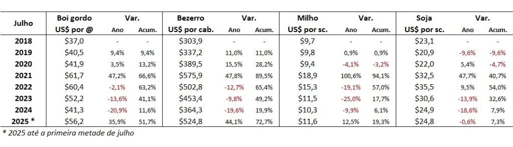 A Tabela abaixo apresenta os dados médios nominais do preço nominal do boi gordo (Cepea), bezerro (Cepea, Mato Grosso do Sul), milho (Cepea) e da soja (Cepea, Paranaguá-PR) nos meses de julho, de 2018 a parcial de 2025 (média até o dia 15).