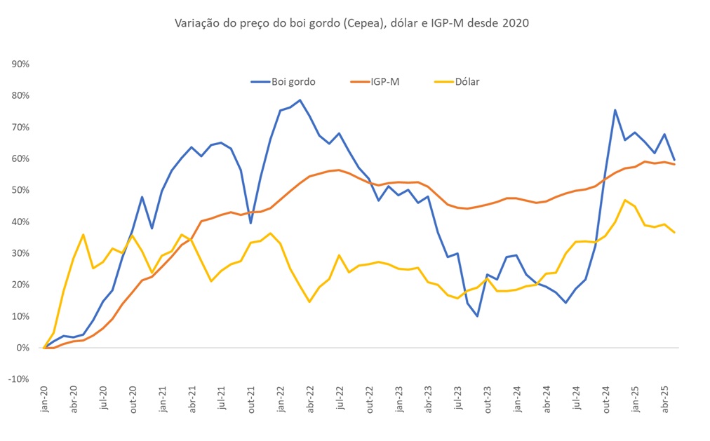 Entre janeiro de 2020 e maio de 2025, o preço do boi gordo (Cepea) acumulou alta de 59,6% e o indicador de inflação, medido pelo IGP-M subiu 58,2% no mesmo período. O dólar foi o que acumulou a menor alta, de 36,6%.