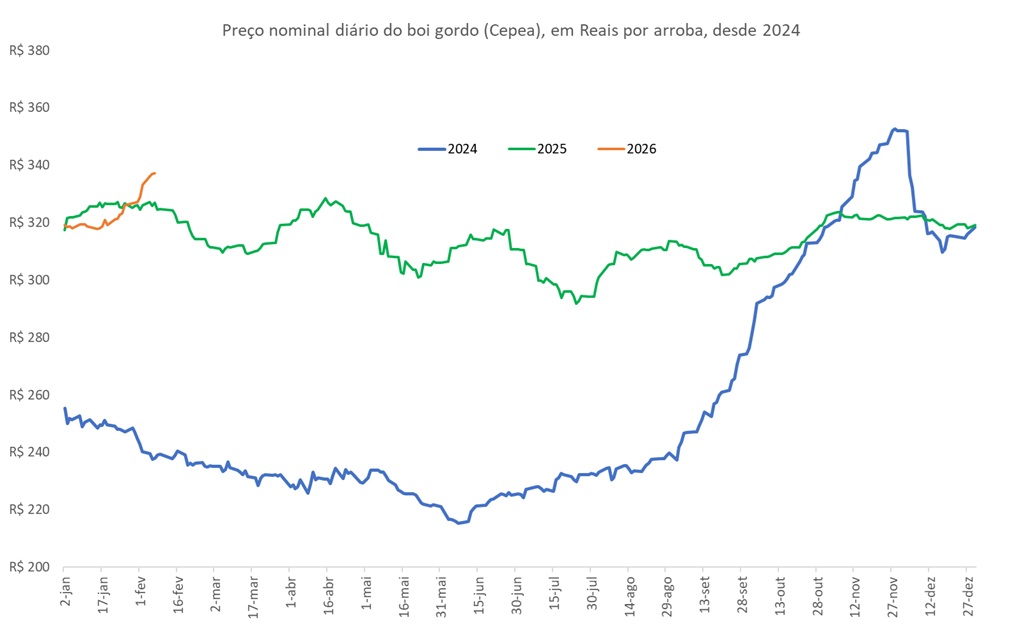 A Figura ilustra a evolução diária do preço nominal do boi gordo (Cepea), em Reais por arroba, desde 2024.