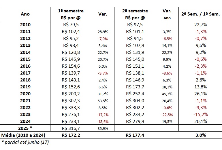 O Farmnews comparou os dados do preço do boi gordo no 1º e 2º semestre entre os anos de 2010 e a parcial de 2025.