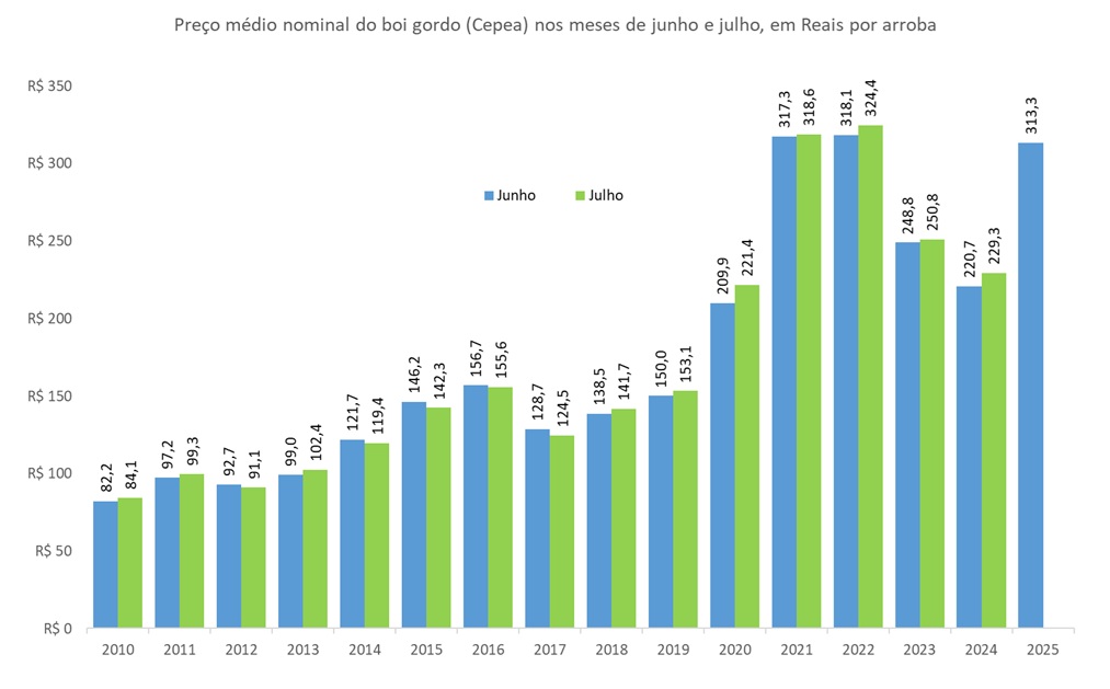 A Figura apresenta os dados do preço médio nominal do boi gordo (Cepea), em Reais por arroba, nos meses de junho e julho, entre 2010 e a parcial de 2025 (junho de 2025 até o dia 27).