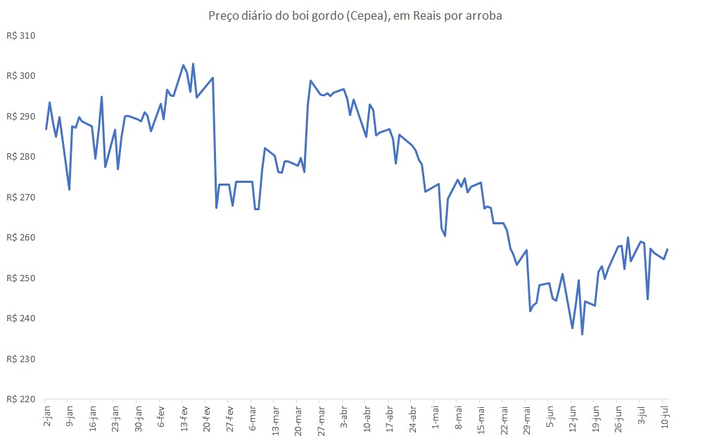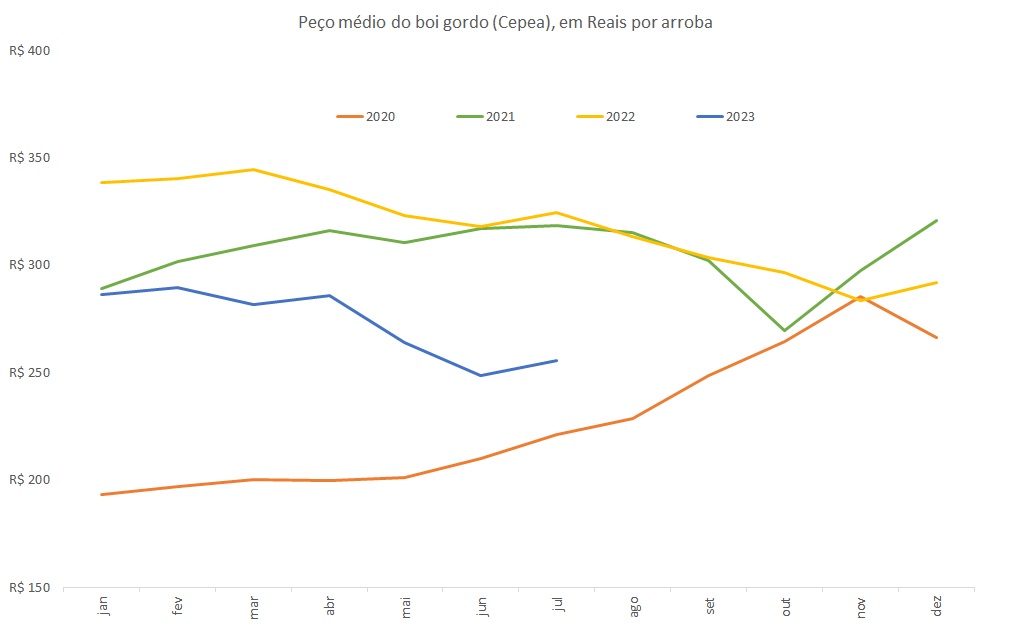 Isso porque até abril de 2023 o preço médio do boi gordo apresentou relativa estabilidade no ano, oscilando entre cerca de R$280,0 e R$290,0 por arroba, em média. Contudo, desde maio o preço do animal pronto para o abate acentuou a perda, até alcançar a mínima de R$248,8 por arroba em junho. Em julho, média até o dia 11, o preço do boi gordo foi cotado a R$255,4 por arroba, alta de 2,7% frente ao mês anterior.