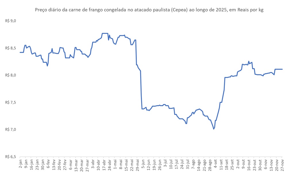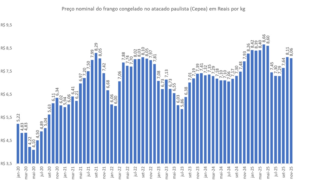 O preço do frango congelado no atacado paulista apresentou média de R$8,06 por kg na parcial de novembro de 2025 (terceira Figura), interrompendo 2 meses consecutivos de valorização, mas ainda acima da média nominal praticada em novembro de 2024 (R$7,93).