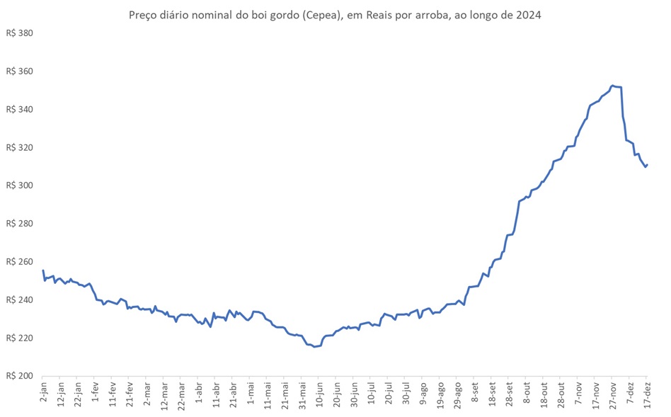 O valor médio parcial de dezembro de 2024, até o dia 17, de R$322,9 por arroba, caiu 4,7% frente ao mês anterior (R$338,8). Contudo, o preço médio de dezembro de 2024 segue acima do recorde nominal para o período do ano, em 2021, quando foi cotado a R$320,9 por arroba (segunda Figura). Vamos acompanhar os preços ao longo da última metade de dezembro para ver se esse novo recorde possa ser, de fato, mantido.