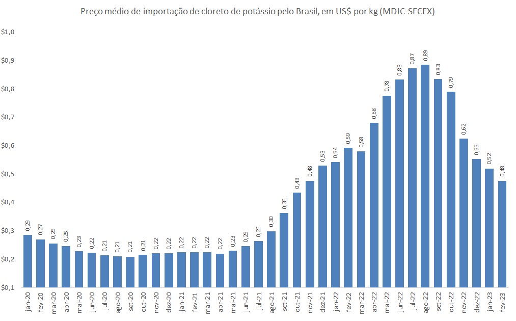 O preço do cloreto de potássio em fevereiro de 2023 de US$0,48/kg foi o mais baixo desde novembro de 2021, quando também foi cotado a US$0,48/kg.
