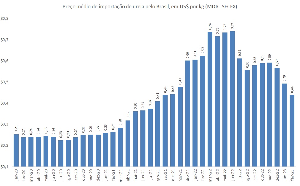 No caso da ureia, nos 2 primeiros meses do ano o preço de importação da matéria-prima acumulou perda de 22,7%, caindo de US$0,57/kg em dezembro para US$0,47/kg em fevereiro de 2023 (terceira Figura abaixo).