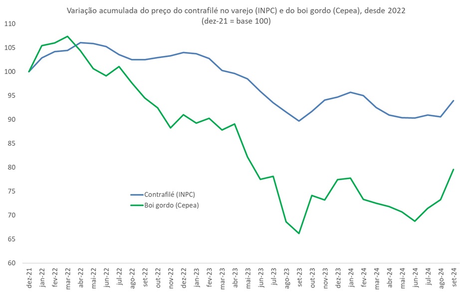 O preço do contrafilé no varejo (média nacional) acumulou queda de 6,1% desde o início de 2022 até setembro de 2024, enquanto no mesmo período o boi gordo caiu 20,4%.