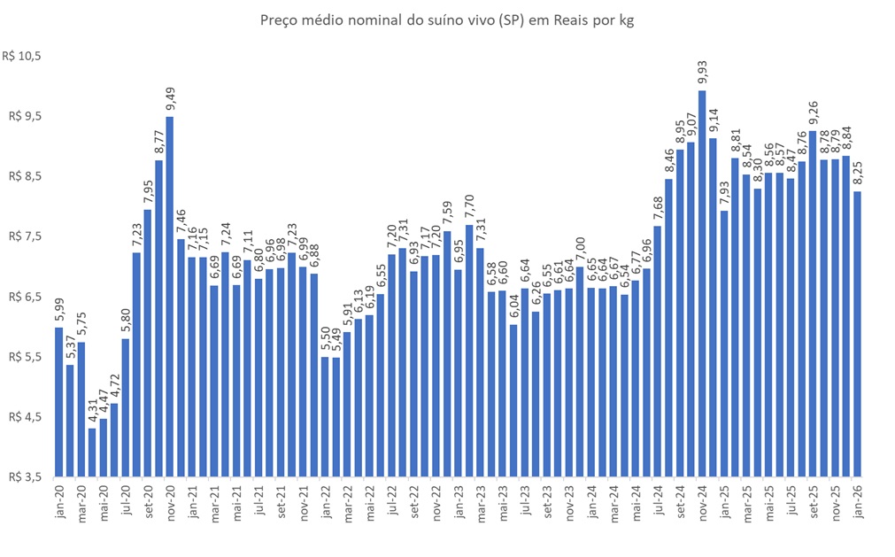 O valor médio parcial do suíno vivo (Cepea, SP) em janeiro de 2026 de R$8,25 por kg, apesar da queda frente aos meses anteriores, ficou acima da média nominal de janeiro de 2025 (R$7,93). É importante observar que tradicionalmente o preço da carne suína apresenta forte queda nos meses de janeiro, após a maior demanda no período das festas de final de ano.