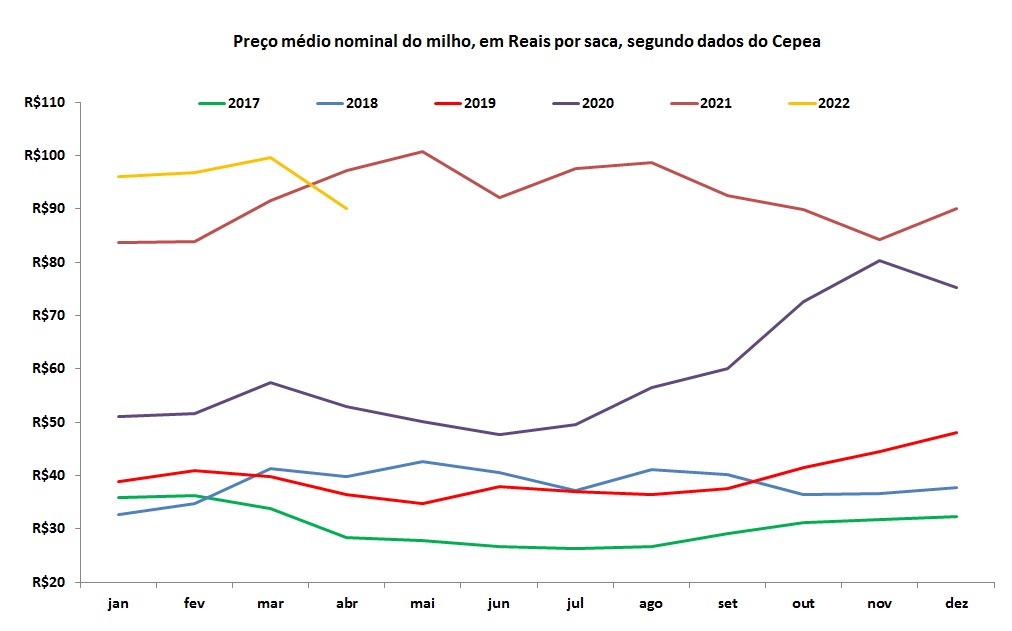 A Figura a seguir ilustra a evolução média nominal do preço do milho (Cepea), em Reais por saca, dentro de cada ano, entre 2017 e a parcial de abril de 2022.