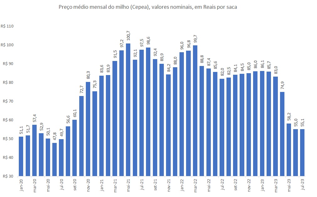 A Figura apresenta dados do preço médio nominal do milho (Cepea), em Reais por saca, entre janeiro de 2020 e a parcial de julho de 2023 (média até o dia 25).