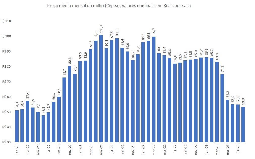 O preço médio do milho na parcial de agosto de 2023 de R$53,3 por saca foi inclusive o menor valor nominal desde julho de 2020, como destacam os dados da segunda Figura.