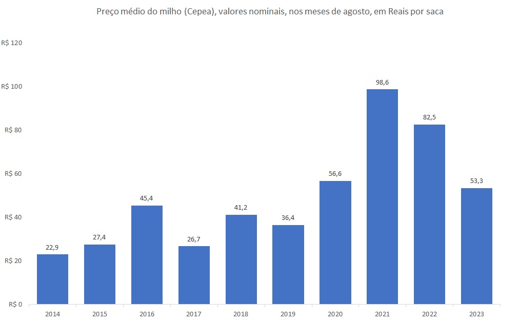 A Figura apresenta os dados médios do preço nominal do milho (Cepea), em Reais por saca, nos meses de agosto, entre 2014 e 2023 (média até o dia 28).