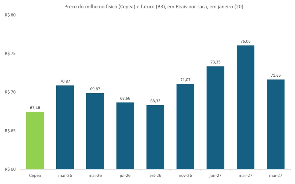 Vale lembrar, por exemplo, que no início de dezembro (1) o preço esperado do milho para março de 2026 era de R$76,0 por saca, valor mais de R$5,0 por acima da expectativa atual. O preço futuro do milho para setembro de 2026 era de R$70,0 por saca em dezembro (1), valor quase R$2,0 por saca acima da expectativa atual.