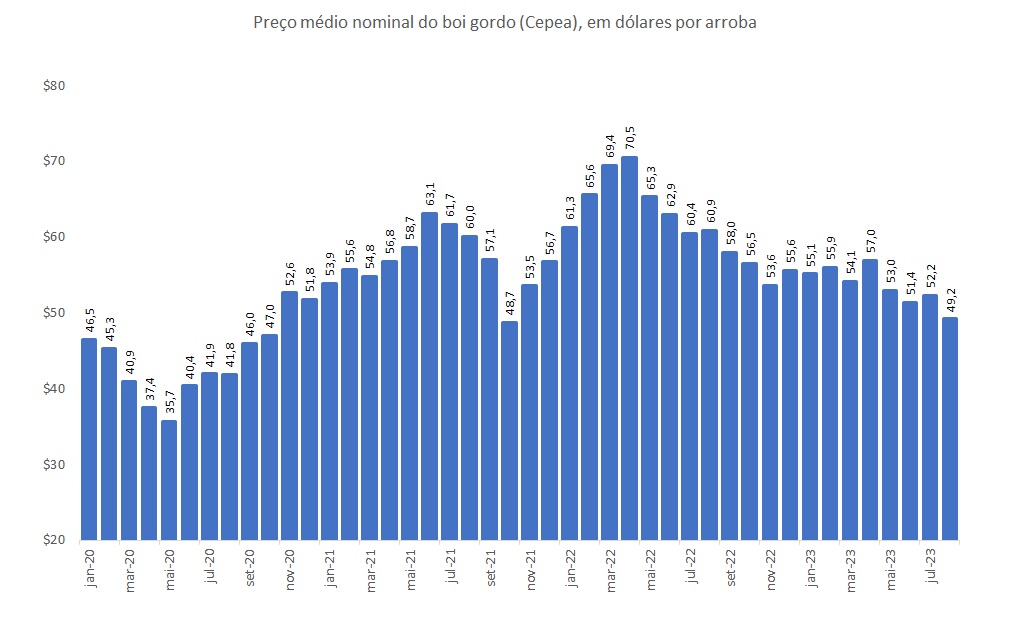 O preço em dólares do boi gordo na média parcial de agosto de 2023, foi de US$49,2 por arroba, o menor valor para um mês de agosto desde 2020.