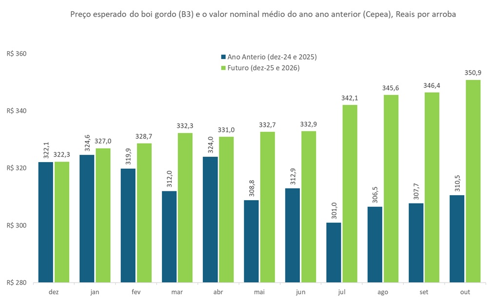 Afinal, qual a expectativa de alta ou baixa do preço esperado do boi gordo na B3 para 2026 em relação ao que foi observado no mesmo período do ano anterior?