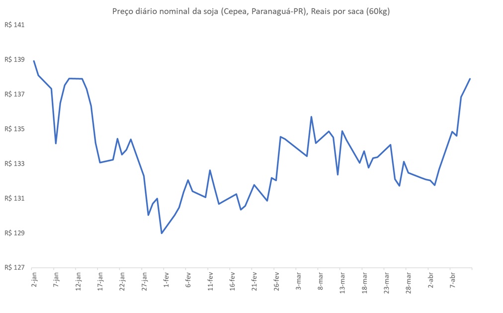 A alta do dólar em abril contribuiu para a recuperação do preço, em moeda nacional, da soja. O dólar médio na parcial de abril (até o dia 11) foi de R$5,82, maior que a média observada em fevereiro e março, com média de, respectivamente, R$5,77 e R$5,74.