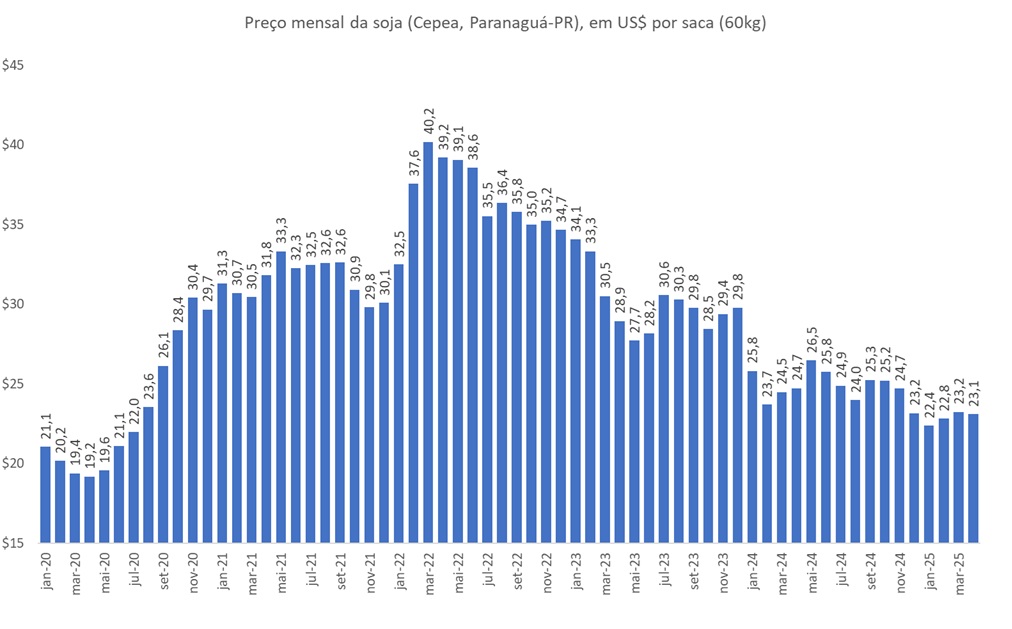 No acumulado do 1º trimestre de 2025, as vendas de soja em grão do Brasil para o mercado internacional foi recorde histórico, somando 22,18 milhões de toneladas, acima do recorde anterior, de 2024, quando as vendas somaram 22,06 milhões de toneladas. Contudo, o preço médio no 1º trimestre de 2025, de US$0,39 por kg foi o menor para o período do ano desde 2020 (US$0,35 por kg).