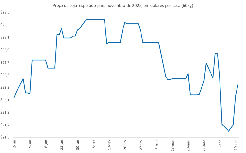 O preço futuro da soja para novembro de 2025 foi cotado novamente acima de US$22,0 por saca após perder esse patamar nos primeiros dias de abril.