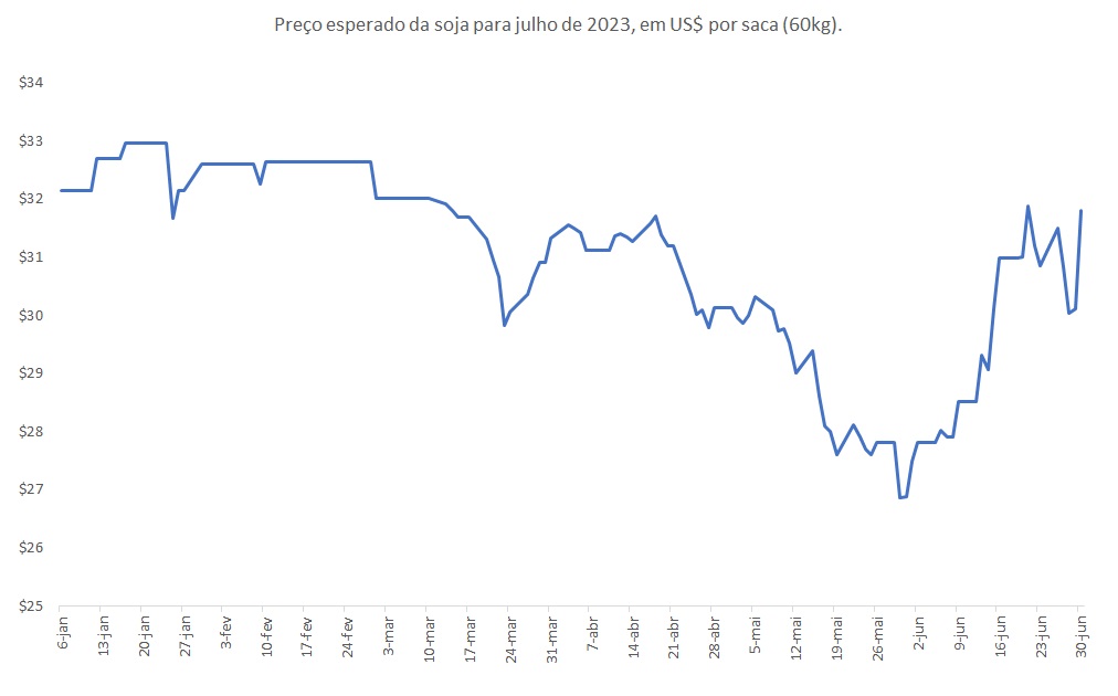 O movimento de recuperação do preço da soja (Figura) no Brasil ganhou mais força no final de junho devido aos dados divulgados pelo USDA que mostram uma queda de 5,0% na área plantada de soja nos Estados Unidos, somando 32,8 milhões de hectares. O preço do contrato para vencimento em julho de 2023 (SJCQ23) encerrou o mês de junho cotado a US$31,8 por saca, valor 18,1% acima do preço praticado no final de maio (US$26,9).