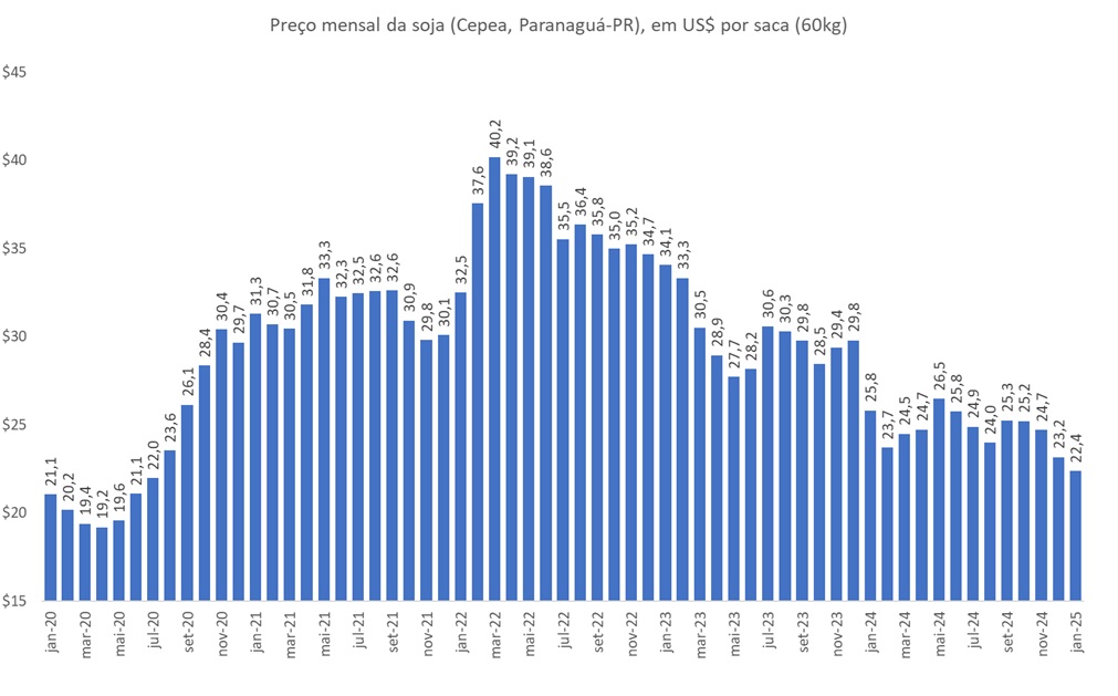 E por falar no mercado físico, o preço nominal da soja no mercado físico (Cepea, Paranaguá-PR), avaliado em moeda nacional, foi cotado a R$133,5 por saca em janeiro (22), valor 4,2% abaixo do valor que encerrou 2024 (R$139,4). O valor médio parcial de janeiro de 2025, em dólares, foi de US$22,4 por saca, acumulando o quarto mês consecutivo de queda e no maior valor desde julho de 2020 (segunda Figura).