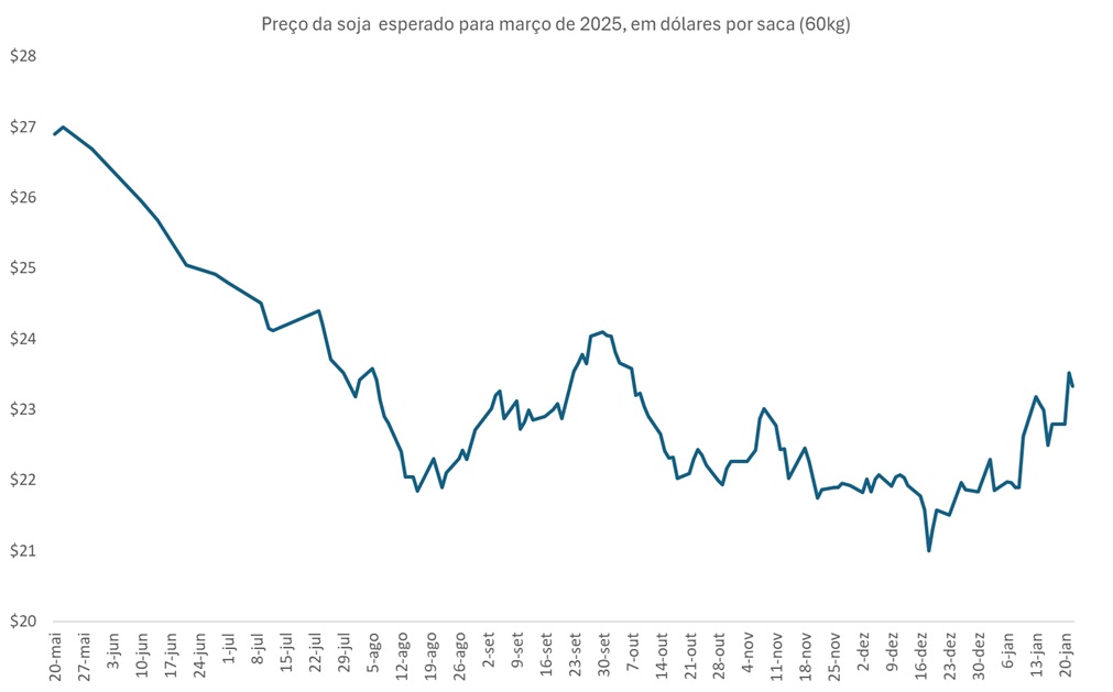 O fato é que o preço esperado da soja para março de 2025 foi cotado a US$23,3 por saca em janeiro (22), e acima do valor atual do grão no mercado físico (Cepea, Paranaguá) de US$22,5 por saca. Na parcial do ano, o contrato para vencimento em março de 2025 acumulou alta de 5,8%, uma vez que encerrou o ano de 2024 cotado a US$21,8 por saca (primeira Figura). No entanto, a alta ainda segue discreta e distante dos patamares já alcançados para o vencimento em março de 2025, entre US$25,0 e US$27,0 por saca.
