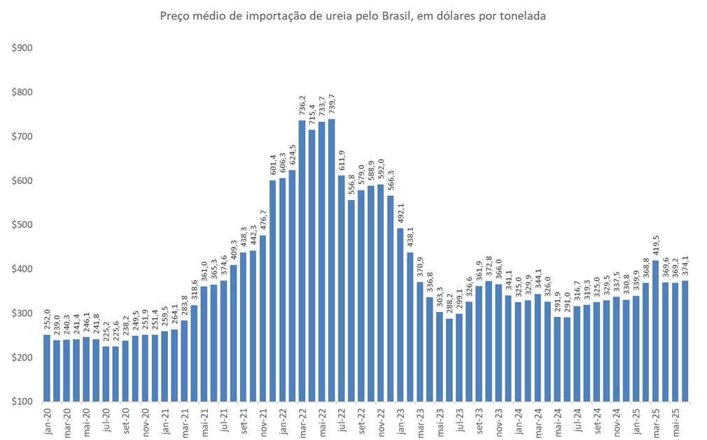 Vale lembrar que o preço médio de importação da ureia pelo Brasil, valor FOB, em junho de 2025, de US$374,1 por tonelada ficou 28,6% acima da média de compra de junho de 2024, de US$291,0 por tonelada, como mostram os dados da primeira Figura abaixo.
