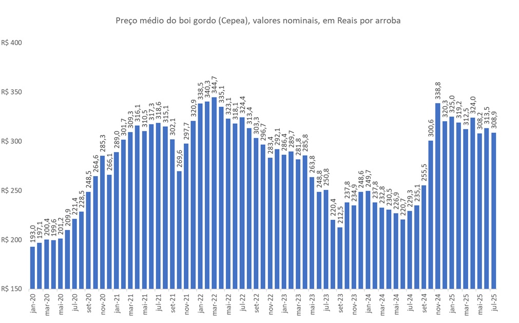A Figura ilustra a evolução mensal do preço nominal do boi gordo (Cepea), avaliado em Reais por arroba, entre janeiro de 2020 e a parcial de julho de 2025 (até o dia 8).