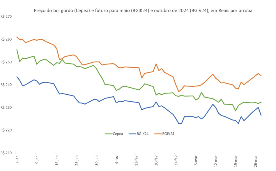 O preço futuro do boi gordo segue projetando queda para maio e alta para outubro em relação a referência no físico no final de março de 2024.