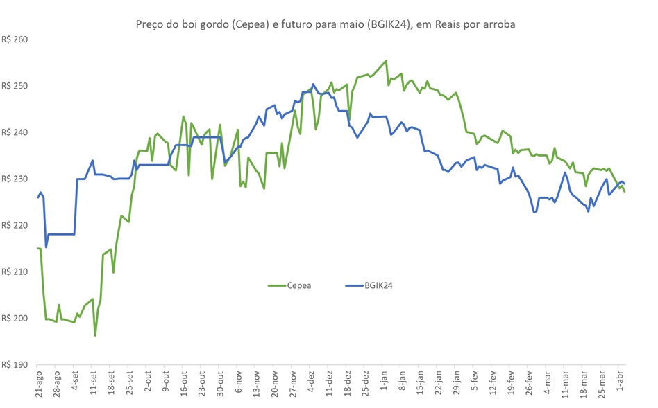 O preço futuro do boi gordo para maio de 2024 foi cotado a R$229,5 por arroba em abril (9), alta de 1,3% frente ao valor que encerrou fevereiro (R$226,6). Na parcial do ano, contudo, o contrato segue acumulando perda, de 5,7%.