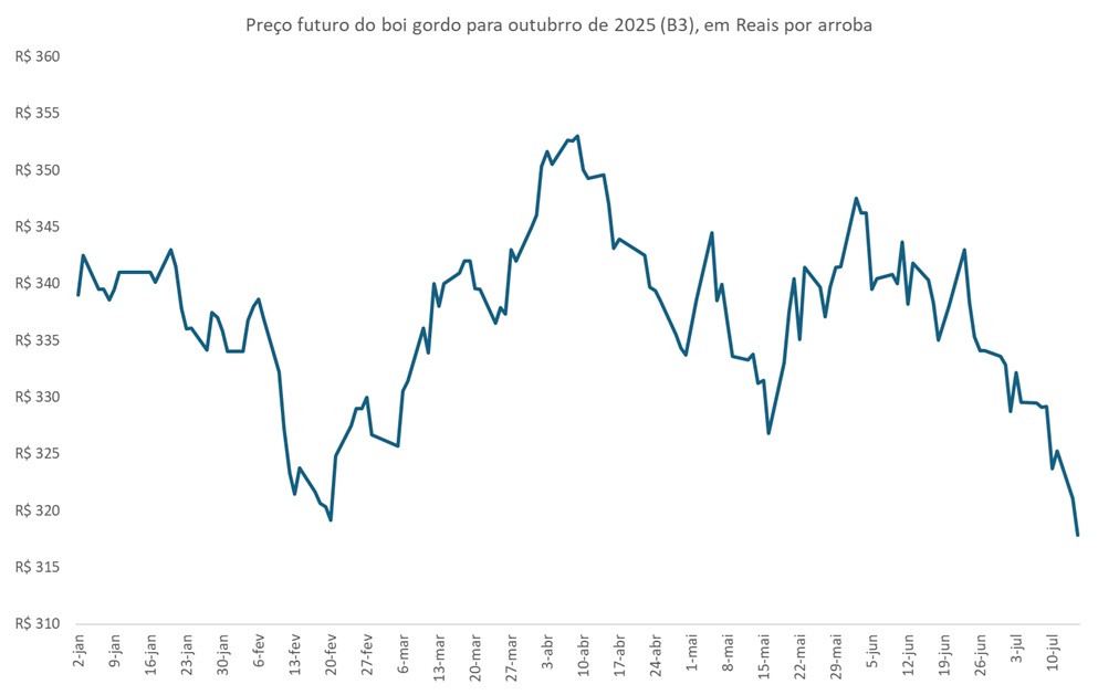 O preço futuro do boi gordo para outubro renovou a mínima para o vencimento em julho (15), cotado a R$317,9 por arroba e, precificando alta abaixo de R$20,0 por arroba em relação a referência no físico.