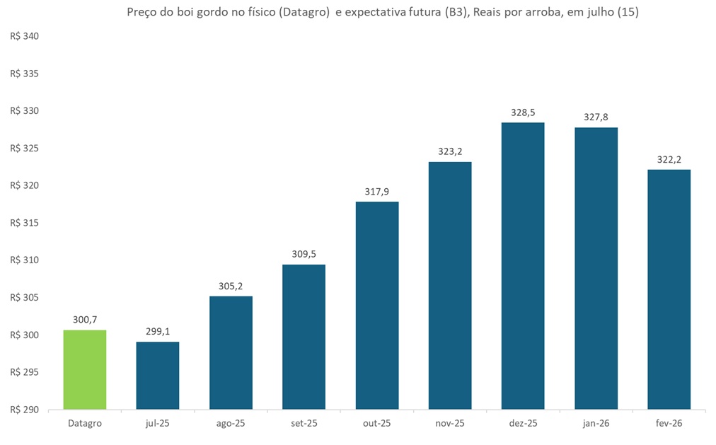A Figura abaixo apresenta dados de preço do boi gordo no mercado físico (Datagro) e dos contratos futuros, segundo B3, entre julho de 2025 e fevereiro de 2026, em Reais por arroba, no dia 15 de julho, considerando os valores do ajuste.
