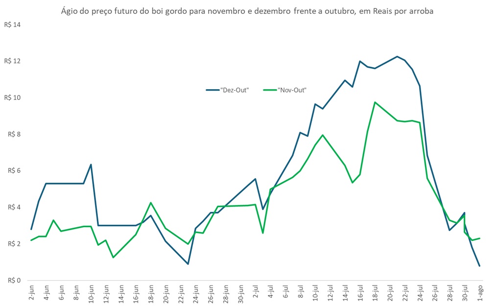 Vale lembrar que ao longo de julho o ágio do contrato para dezembro frente a outubro chegou a oscilar em torno de R$12,0 por arroba e no início de agosto caiu para pouco menos de R$1,0 por arroba (Figura acima).