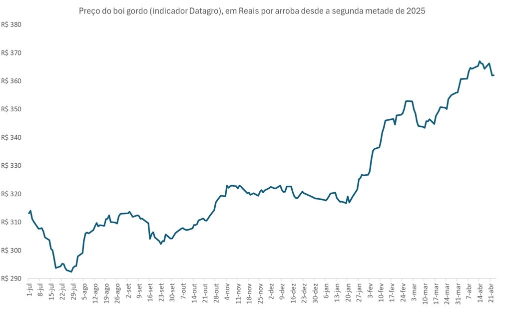 O preço futuro do boi gordo na B3 segue bastante descolado do preço atual da arroba no mercado físico (Datagro) em abril, com o contrato para maio, por exemplo, precificando queda próxima de R$20,0 por arroba em abril (23).