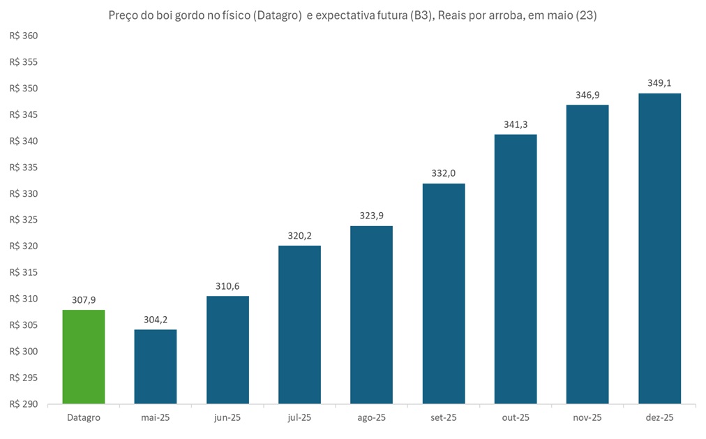 O preço futuro do boi gordo para outubro de 2025 que chegou a ser negociado em torno de R$326,0 por arroba na mínima de maio (16), mostrou recuperação, voltando acima de R$340,0 por arroba em maio (23).