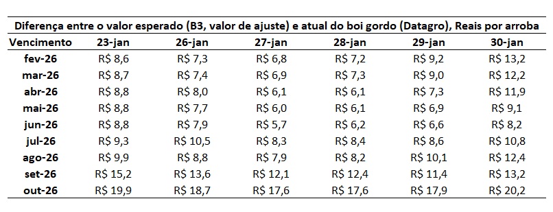 O mesmo acontece para o vencimento de outubro de 2026, já que em janeiro (28), a expectativa de alta frente ao físico (Datagro) era de R$17,6 por arroba e em janeiro (30) esse valor subiu para R$20,2 por arroba.