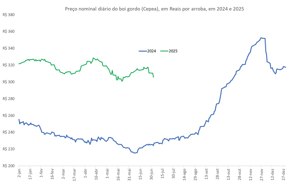 A Figura ilustra a evolução diária do preço nominal do boi gordo (Cepea), avaliado em Reais por arroba, ao longo de 2024 e a parcial de 2025.