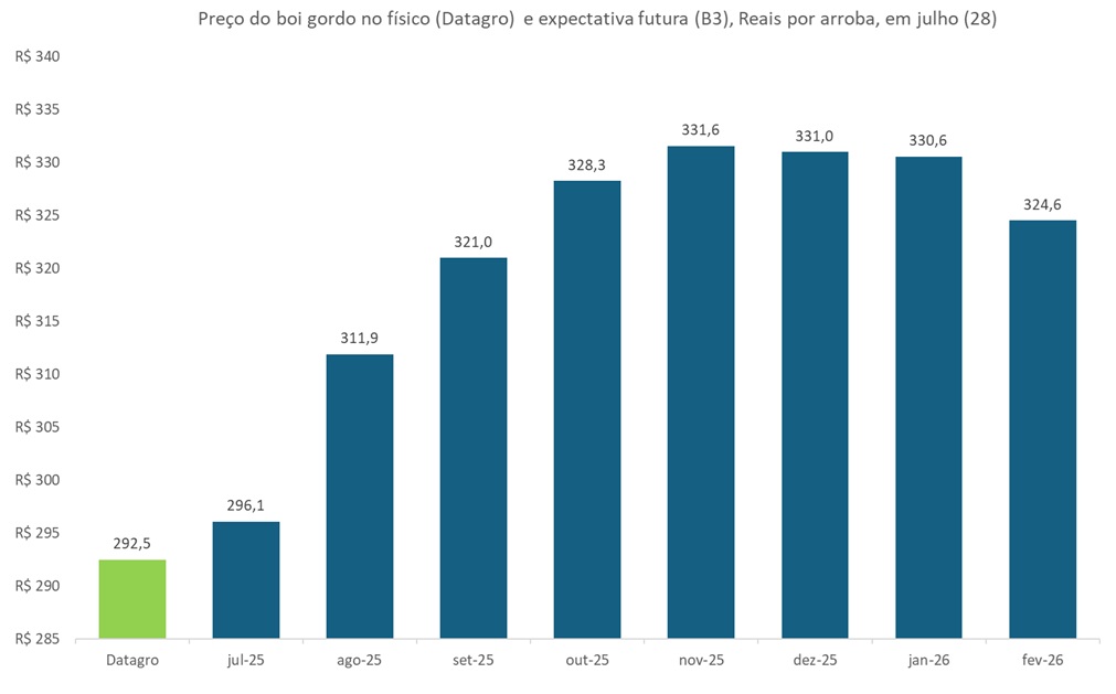 A Figura abaixo apresenta dados de preço do boi gordo no mercado físico (Datagro) e dos contratos futuros, segundo B3, entre julho de 2025 e fevereiro de 2026, em Reais por arroba, no dia 28 de julho, considerando os valores do ajuste.