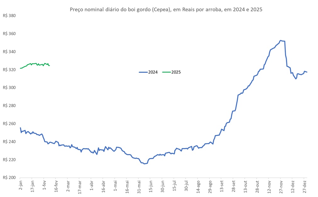 A Figura a seguir ilustra a evolução diária do preço nominal do boi gordo (Cepea) em 2024 e 2025, em Reais por arroba.