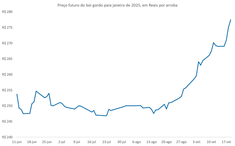 O preço futuro do boi gordo para janeiro de 2025 foi cotado a R$277,5 por arroba na parcial de setembro (19), na máxima para o vencimento!